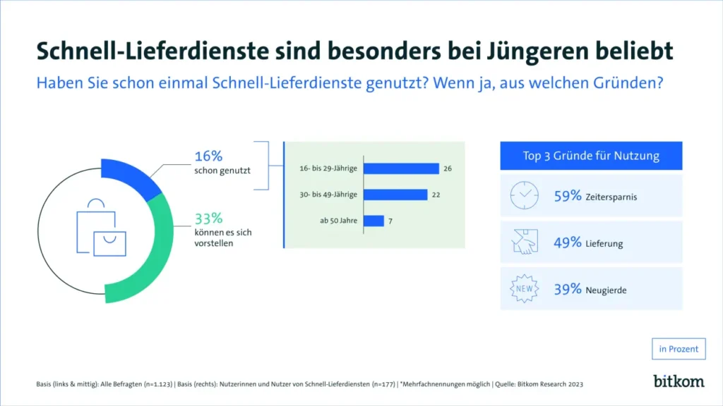 Dabei gibt es durchaus Hoffnung für entsprechende Angebote: Wie eine Bitkom-Umfrage zeigt, sind sie bei den 16- bis 29-Jährigen (26 Prozent) und den 30- bis 49-Jährigen (22 Prozent) deutlich beliebter. Zudem kann sich ein Drittel aller Befragten gut vorstellen, künftig einen Schnelllieferdienst in Anspruch zu nehmen. Die bisherigen Kunden schätzen die Zeitersparnis (59 Prozent) und/oder die Lieferung bis an die Haustür (49 Prozent). Auch längere Öffnungszeiten (24 Prozent), attraktivere Rabatte als im stationären Handel (18 Prozent) und günstigere Preise (10 Prozent) werden positiv bewertet.